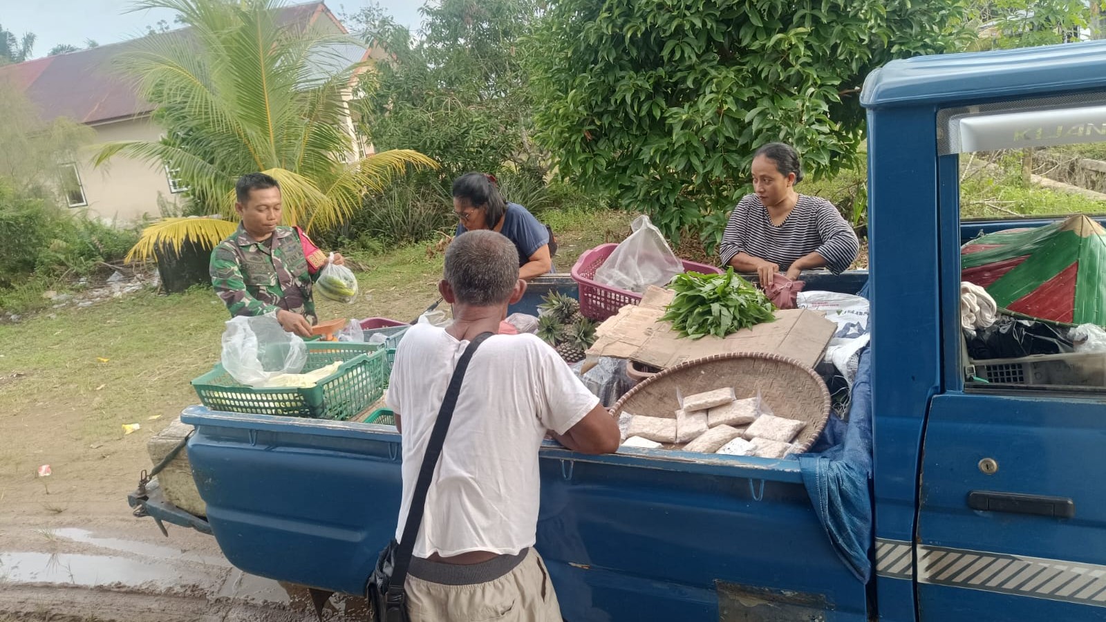 MEMBALONG: Babinsa Desa Perpat Koramil 414-04/Membalong, Sertu Didi K, melaksanakan kegiatan komunikasi sosial (Komsos) bersama warga binaan dan penjual sayuran keliling di Dusun Kepang, Desa Perpat, Kecamatan Membalong, Kabupaten Belitung, Kamis (18/12/2025).