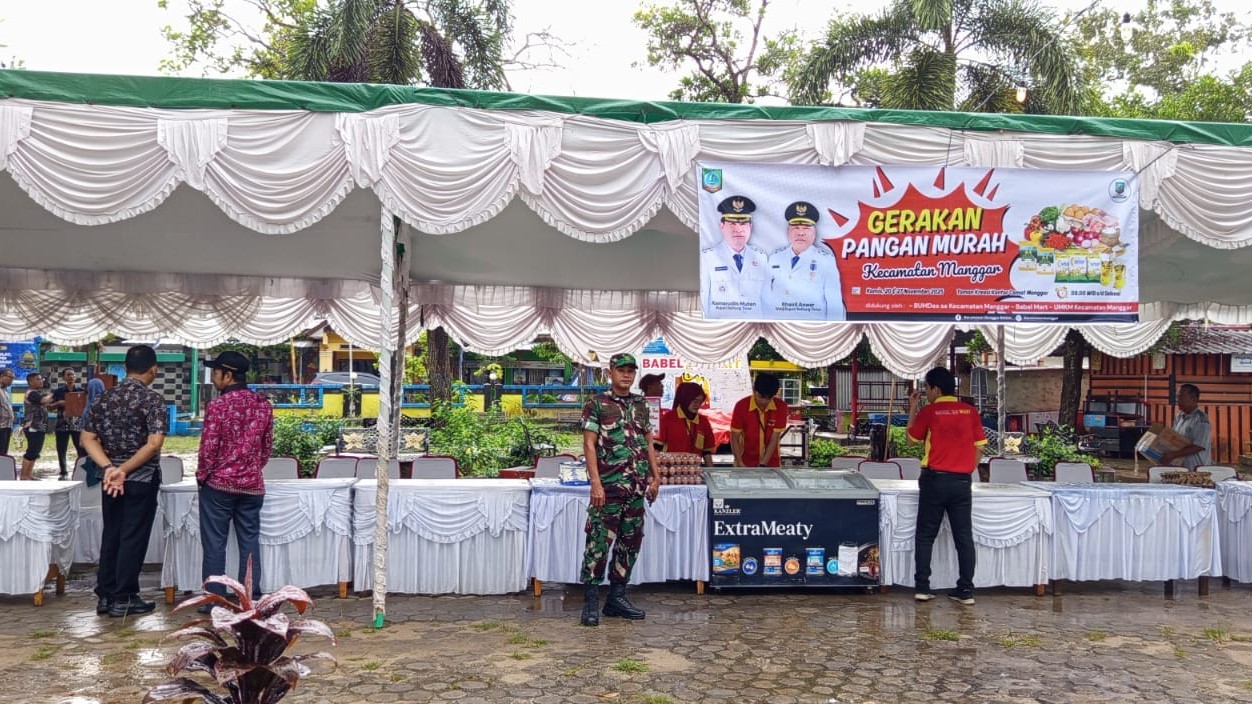 MANGGAR – Koramil 414-02/Manggar melalui Babinsa Serda Dedi Irawan melaksanakan monitoring kegiatan Gerakan Pangan Murah yang berlangsung di halaman depan Kantor Camat Manggar, Kabupaten Belitung Timur, pada Kamis (20/11/2025) pukul 08.00 WIB.