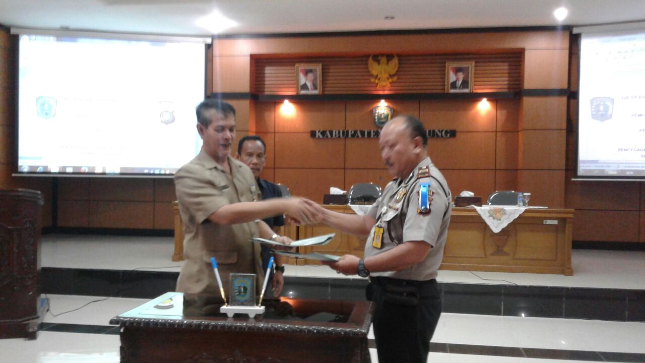 TANJUNGPANDAN: Pemkab Belitung bersama dengan kepolisian resort Belitung melakukan kerja sama tentang pencegahan, pengawasan, dan penanganan permasalahan desa, yang bertempat di ruang Kantor Bupati Belitung, pada hari ini kamis 28 Desember 2017.