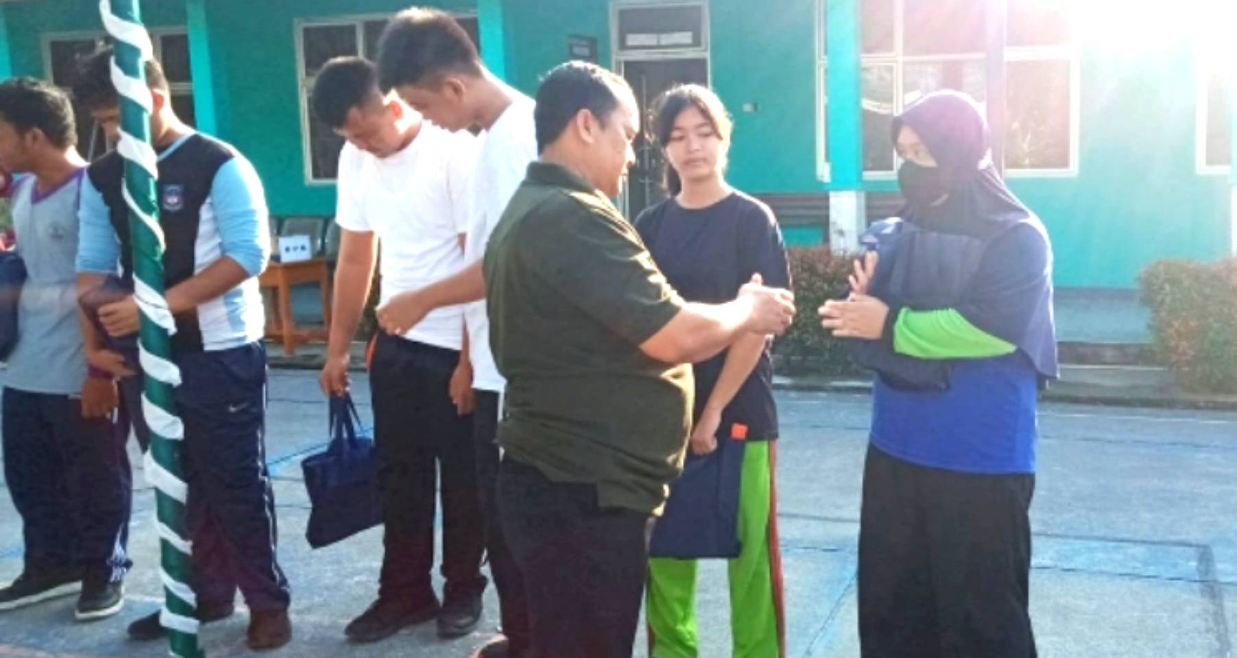 TANJUNGPANDAN: Kepala SMK Yaperbel 2 Tanjungpandan menyerahkan secara simbolis tas sekolah dan alat tulis kepada para siswa-siswi baru untuk pendaftaran gelombang pertama dan kedua bagi PPDB (Penerimaan Peserta Didik Baru) tahun 2023, dalam sebuah acara serimonial usai digelarnya kegiatan senam pagi yang bertempat di aula Futsal SMK Yaperbel 2 Tanjungpandan, pada jumat 28 Juli 2023, kemarin.