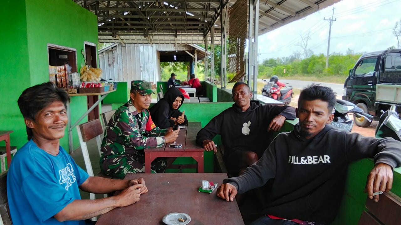 MANGGAR – Anggota Koramil 414-02/Manggar, Serka Gatot S, Babinsa Desa Baru melaksanakan kegiatan Komunikasi Sosial (Komsos) bersama warga binaan di salah satu warung kopi di Kecamatan Manggar, Kabupaten Belitung Timur, pada Minggu (28/9/2025).