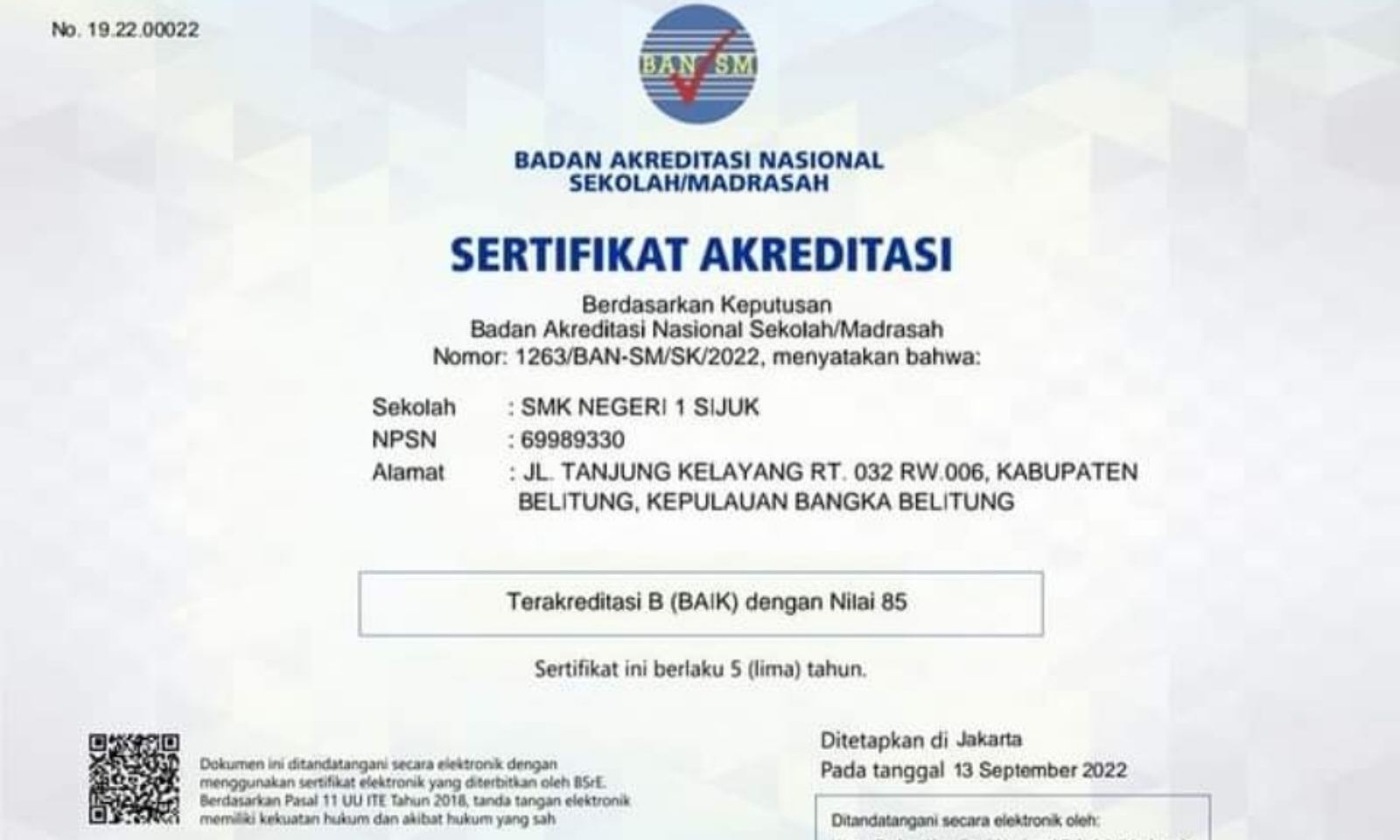 SIJUK: SMK Negeri 1 Sijuk terakreditasi B berdasarkan Keputusan Badan Akreditasi Nasional Sekolah/Madrasah Nomor: 1263/BAN-SM/SK/2022.